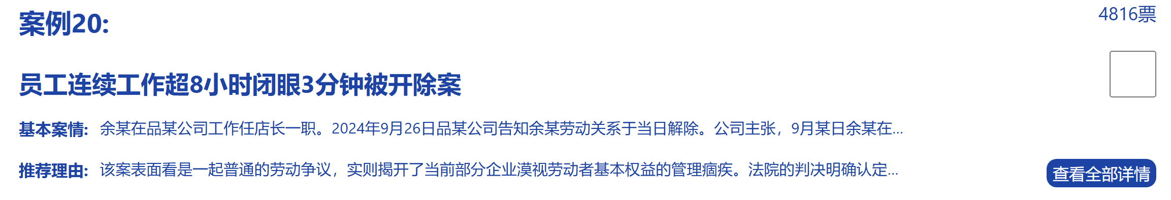 点击下方链接可进入网络投票环节,对案例20(员工连续工作超8小时闭眼3分钟被开除案)进行投票。