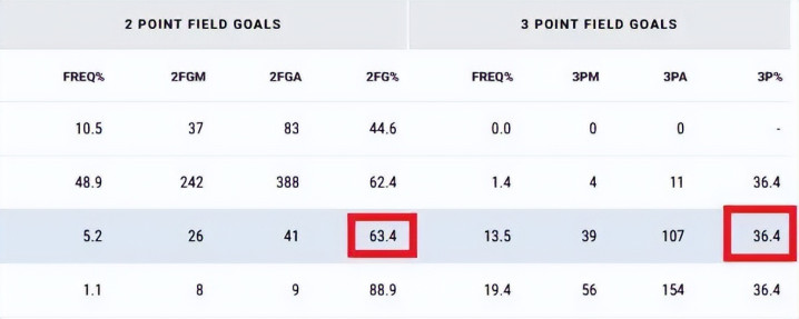 据NBA官网数据显示,防守人处于4-6英尺准空位下约翰逊两分投篮命中率63.4%、三分投篮命中率36.4%。