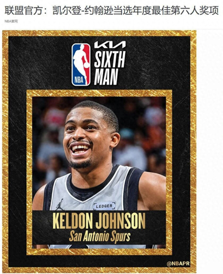 据NBA中国官网报道,凯尔登·约翰逊战胜小蒂姆·哈达威、小海梅·雅克荣膺25-26季年度最佳第六人。