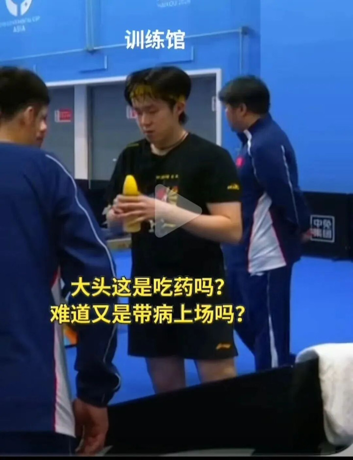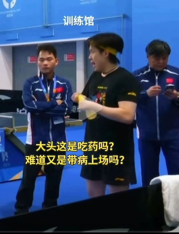 视频中,王楚钦先是接过牛冠凯递出的瓶盖子,再是直接倒进嘴里,之后又接过水来仰头咽下,和大家平时喝药的动作完全一样。